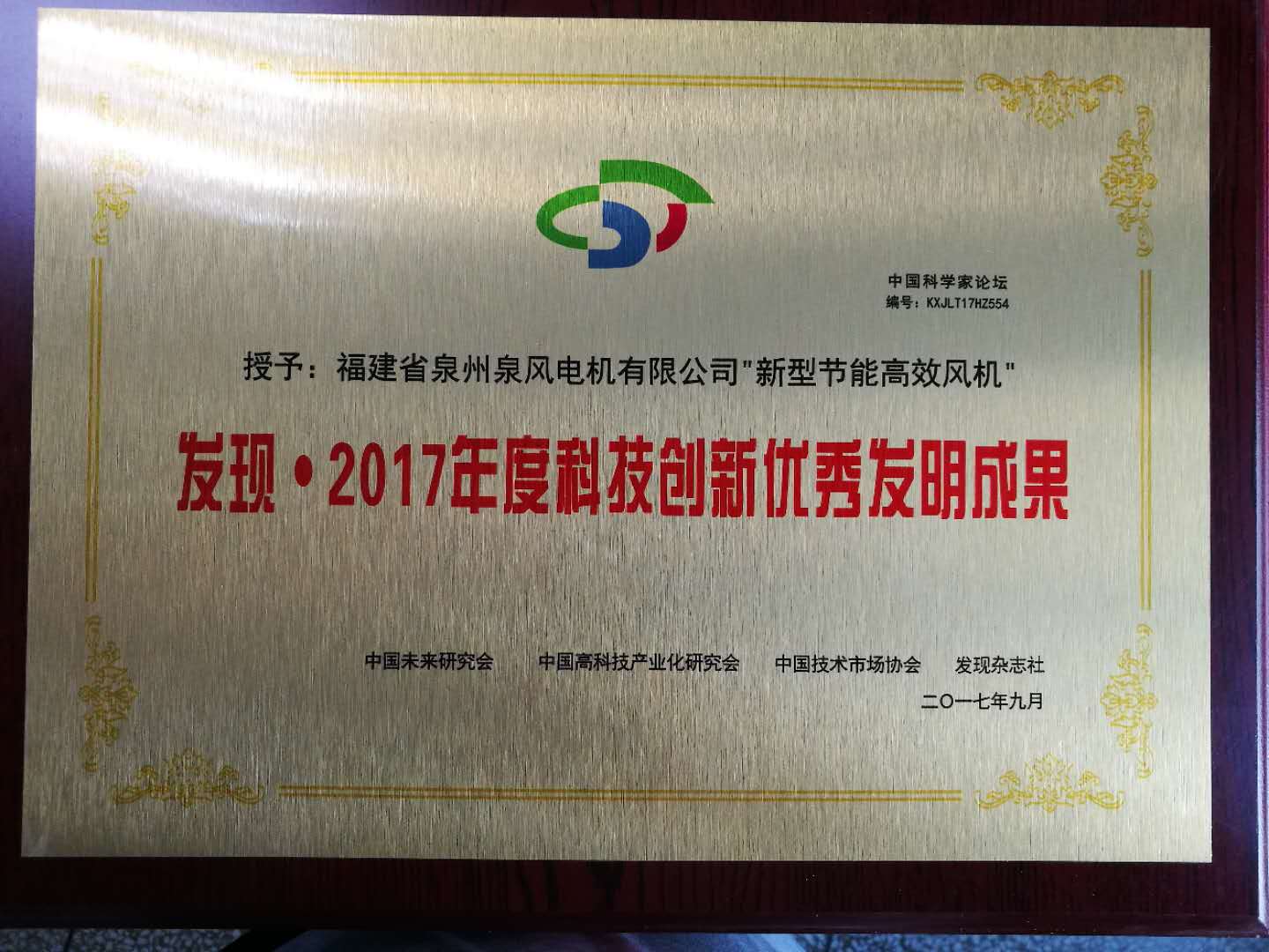 The company won the "discovery. 2017 National Science and technology innovation outstanding achievement award" with a new energy-saving and high-efficiency fan